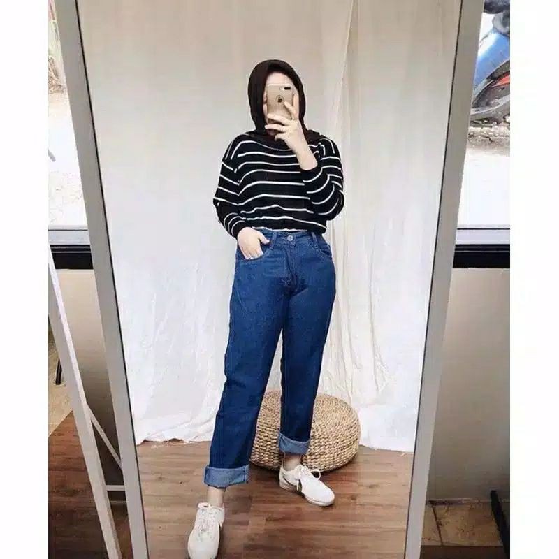 Untuk tampilan yang pertama, kamu bisa menggunakan atasan kaos lengan panjang dengan motif strip. Atasan yang satu ini sangat sering digunakan oleh pengguna street style, yang dipaduakn dengan straight pants.